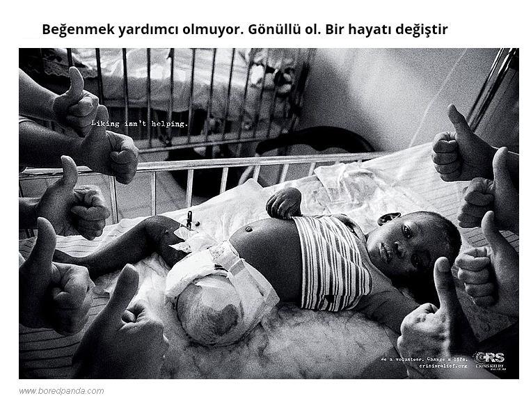 Bizim kör göze parmak kamu spotlarımızı falan görünce bunlar hazine gibi geliyor bana. Sosyal farkındalık oluşturma amaçlı çalışmalardan kısa bir derleme. Diğer güzel ve çarpıcı çalışmalar için link.